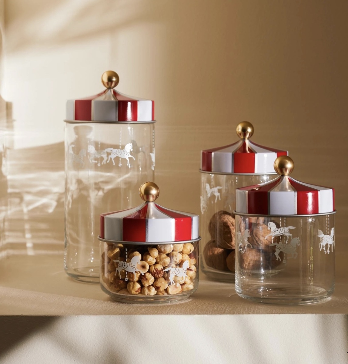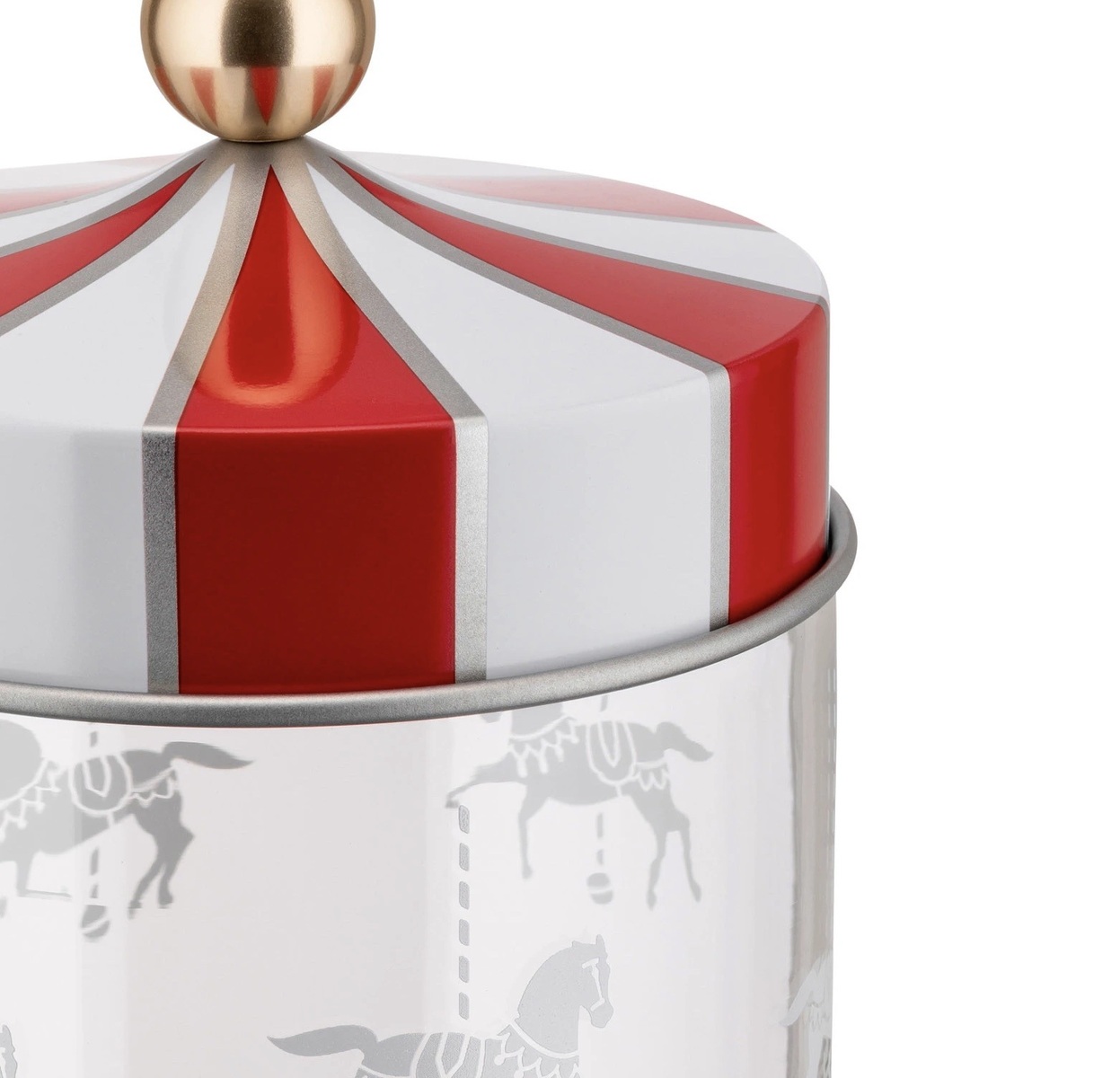 Το σκέπασμα είναι διακοσμημένο με τις παραδοσιακές άσπρες και κόκκινες ρίγες της τέντας του λούνα πάρκ, ενώ η «χρυσή» λαβή φέρνει στον νου το διακοσμητικό στοιχείο που στολίζει το κέντρο της. Το αποτέλεσμα είναι διασκεδαστικό, μεταμορφώνοντας ένα βάζο κουζίνας σε μια βόλτα με το καρουσέλ.